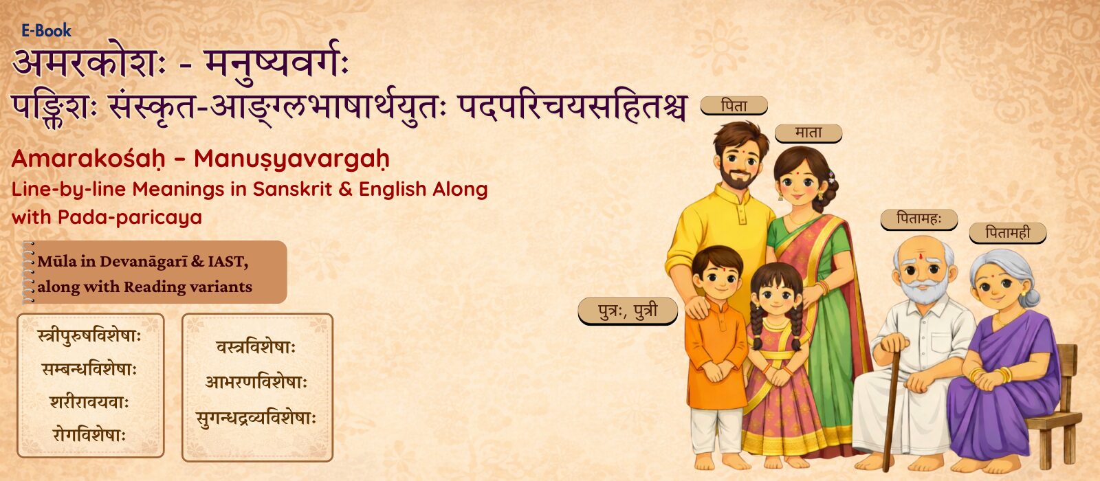 This E-book presents the Manushyavarga of the Amarakosha which is a comprehensive vocabulary describing human life in its physical, social, and ethical aspects. It mainly deals with words related to human beings and human society including terms denoting human birth, body parts, stages of life, and social identity. Names for men and women, relatives, castes, professions, and occupations are explained here. The varga also lists words for virtues, vices, mental states, and personal qualities.